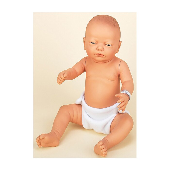 Teach newborn care with this soft, amazingly lifelike vinyl model of a 1-day-old male infant. Fully jointed at the neck, shoulders, and hips, the model is anatomically correct (foreskin intact). Comes with cloth nappy with Velcro fasteners, birth certificate, and hospital identification bracelet. 53 cm long; 1.13 kg. Models are available in both sexes. Brown, African, and Asian models also available.